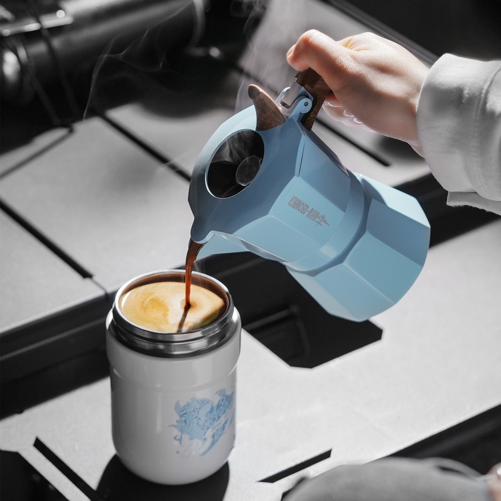 Whether you're brewing on a mountaintop or at your kitchen table, the sleek moka pot and case bring style and substance. -