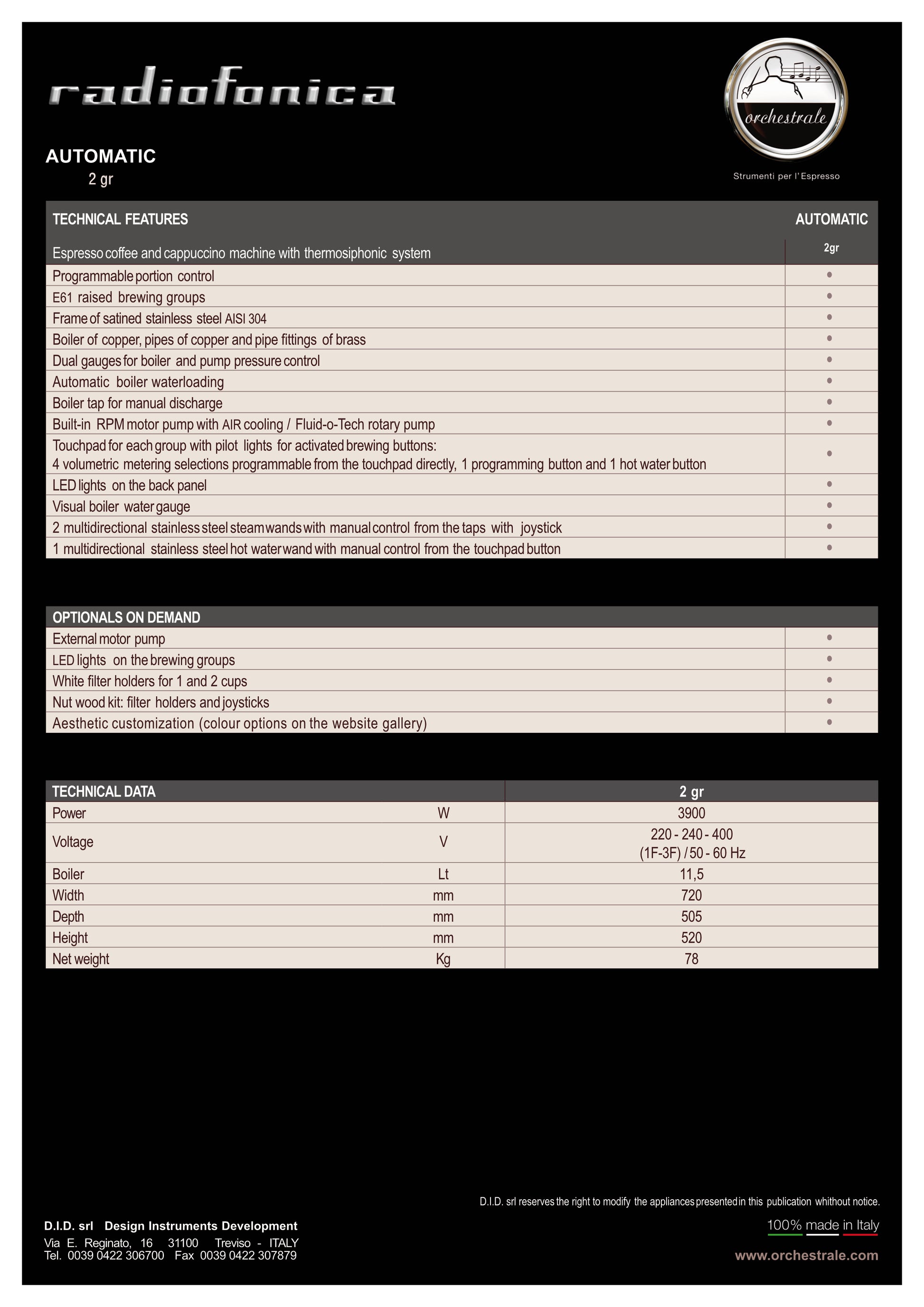 Radiofonica automatic with two raised E61 brewing groups, joystick taps, programmable portion control, single group washing, dual gauges for (11,5 litres) boiler and pump pressure, professional sized rotary pump (200 l/h), automatic boiler water loading, motor pump with air cooling, boiler of copper with tap for manual discharge, pipes of copper and pipe fittings of brass, bulb capillary thermostat for heating element protection, frame of satined stainless steel AISI 304 painted in different standard Matt color options: white, black, blue Tiffany, rust brown, copper.