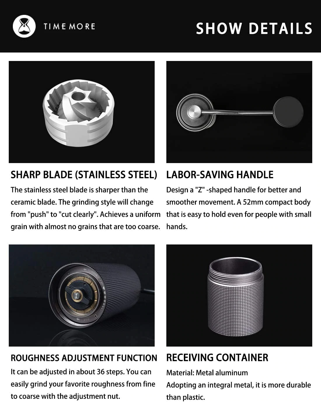 Of all the revisions found on the Timemore C2 Max, the increased capacity 25 to 30 grams is the most welcomed. And while Timemore’s stepped adjustment dial isn’t exclusive to the C2 Max, it still remains a favored and approachable system for ensuring that you achieve the same premium results in your grind every time. Timemore also includes a manual with the C2 Max that features recommended starting points for your preferred brewing method, an incredibly helpful tool for those just introducing the routine of brewing coffee from the comfort of home to their daily lives.